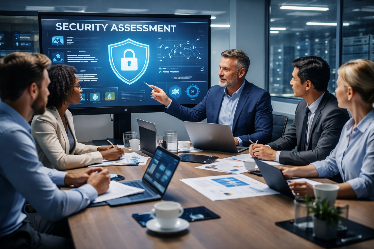 Definição de objetivos de segurança alinhados com o contexto operacional, desenho da arquitetura integrada, avaliação do custo-benefício e estruturação do plano de implementação.